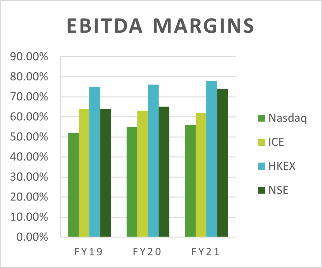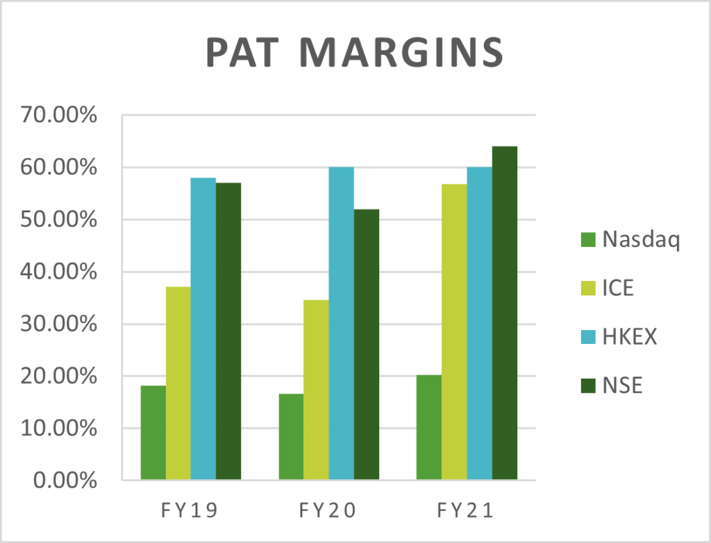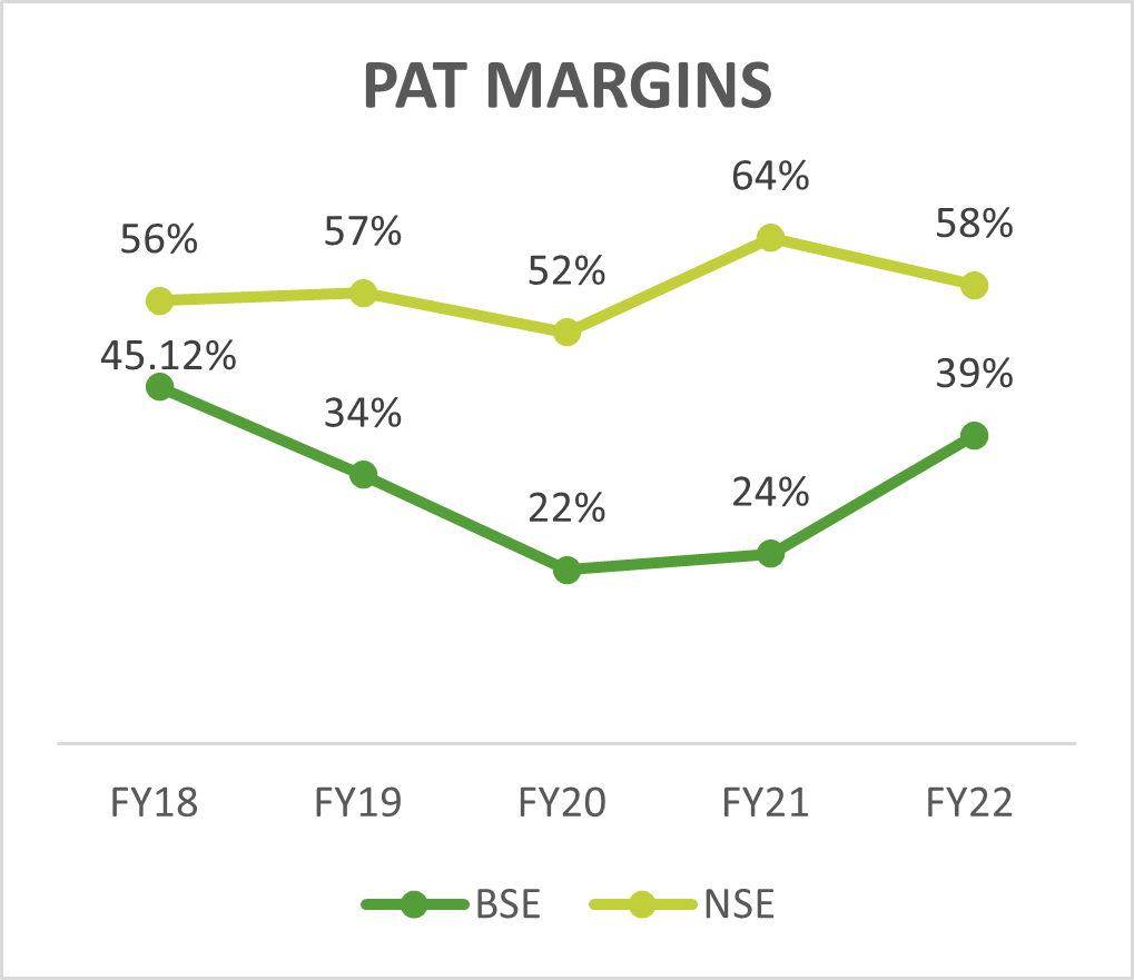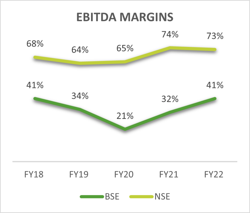 But still NSE has better margins. Here is a comparison between the margins of NSE and BSE. Clearly, NSE has better margins in both EBITDA and PAT.