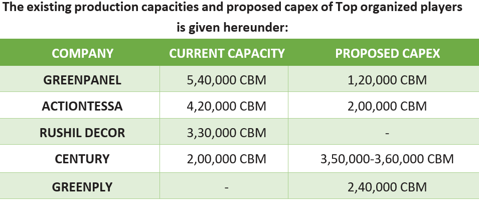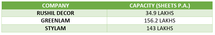 2. New Entrants: For the laminate segment, entry barrier in terms of required capex is pretty low. There always remains a pressure of new entrants getting in the organized market, which has been the case, leading to higher competition.