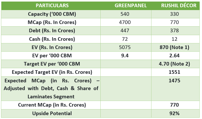 1. Total EV of Rushil Décor is Rs. 1,160 Crores. However, approximately 25% of this value is contributed by its Laminates Segment. Hence, EV for MDF segment = Rs. 870 Crores.