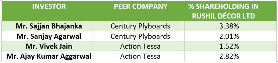 When promoters buy-back, it is a positive sign. But, when the competitor companies’ promoters take stake in the peer company that significantly boosts investor confidence as they are the most clued people to know about the industry prospects. This keenly watched attribute adds to the assurance factor for the investor. This scenario is being seen in the emerging MDF industry. The leading MDF players like Century Plyboards and Action Tessa have bought stake in Rushil Décor.