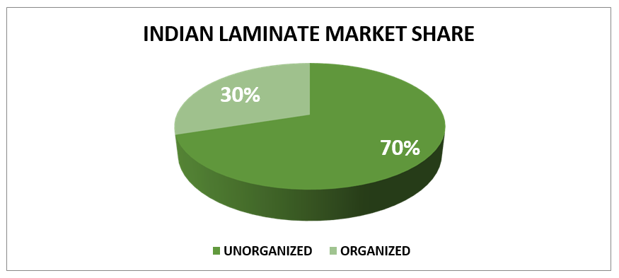 Indian Laminate market size is Rs. 5000 Crores. Major chunk of market is enjoyed by the unorganized sector due to low-capital intensive industry. Apart from voracious consumer demand, implementation of tax reforms such as GST is expected to aid the organized manufacturers capture a larger market share as against their unorganized counterparts.