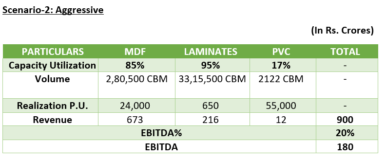 3. Under the aggressive scenario, the MDF segment is expected to operate at 85% Capacity. In this case, the topline is expected to multiply 2.5X and EBITDA margin will improve to approx. 20%.