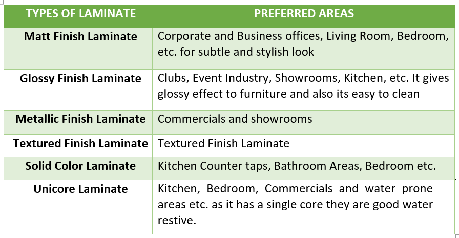 • Laminates provide a better surface finish for furniture elements and also provide an attractive look for a very less price. Furniture like tabletops, cupboards, surfaces of chairs mostly uses laminates as the finish material.