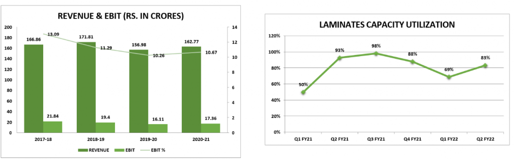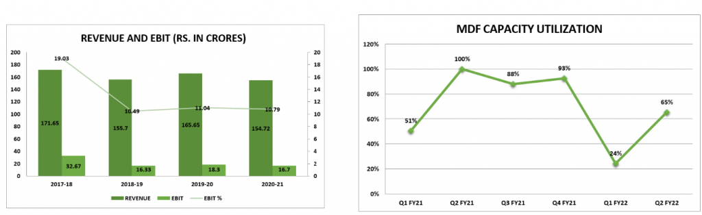 1. EBITDA margins have declined in Q1 FY22 and H1 FY22 as the company has commenced commercial operations at its new MDF manufacturing plant at Andhra Pradesh leading to higher costs. These costs are expected to taper down gradually with improved capacity utilization.