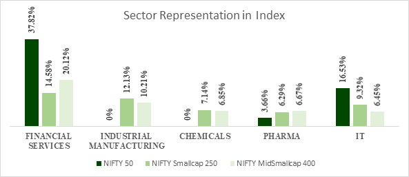 The NIFTY 50 gives a weightage of 37.82% to financial services which is quite high as compared to 14.58% in NIFTY SMLCAP 250.