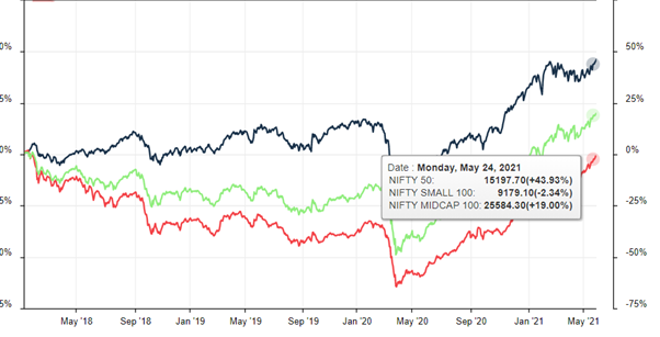 Similar scenario was observed from April 2012-2014 when the small and mid-cap indices under-performed the large cap index. This was followed by a good rally from May-2014 to Jan-2018 in small and mid-cap generating 33% CAGR returns.