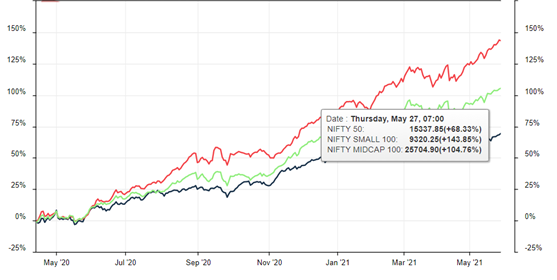 Last One Year Performance Chart of NIFTY 50, NIFTY SML 100 & NIFTY Midcap 100